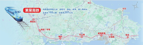 莱荣高铁则是青银高铁通道向山东半岛地区的延伸,线路西起莱西北站,经青岛、烟台、威海,接入荣成站,正线长193公里,总投资297亿元,全线设莱西北、莱阳丁字湾、海阳、乳山南、威海南海、文登南、荣成7座车站。